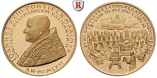 Goldmedaille 6,9 g fein, 1962. (von Giampaoli) auf die Eröffnung des Zweiten Vatikanischen Konzils: 1962-1965. Büste von Papst Johannes XXIII. / Christus in Wolken über Konzilsteilnehmern. 22 mm, 7 g, GOLD, Polierte Platte, kl. Flecke