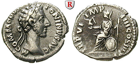 Zur Münzgeschichte: Die Münzprägung des Commodus unterteilt sich in drei signifikante Abschnitte. 175 bis 177 prägte er als Caesar. Die Münzen zeigen ein jugendliches Portrait, der Kopf trägt meistens keinen Lorbeerkranz. 177 bis 180 prägte Commodus als Augustus und Mitregent des Marcus Aurelius. Das Portrait zeigt noch immer recht jugendliche Züge, der Kopf ist allerdings meistens bekränzt. Die Titulatur ist L(ucius) AVREL(ius) COMMODVS. In den ersten Jahren seiner Alleinherrschaft ab 180 nennt er sich M(arcus) COMMODVS ANT(oninus) AUGVSTVS und verweist damit auf seinen Vater Marcus Aurelius und dessen Vorgänger Antoninus Pius. Ein fundamentaler Wechsel in der Titulatur findet 191 statt. Der Herrscher nennt sich nun L(ucius) AEL(ius) AVR(elius) COMMODVS und legt die beiden Namensteile, die sich auf seine Vorgänger beziehen, ab.
