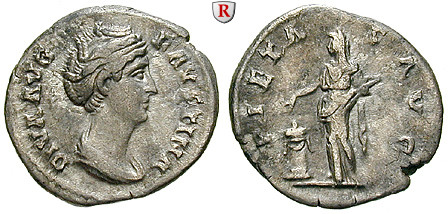Zur Münzgeschichte: Die meisten erhaltenen Münzen sind in Rom geprägt, und zwar posthum (= nach ihrem Tode). Daher ist es nicht verwunderlich, daß sie auf den Münzabbildungen etwas matronenhaft wirkt. Es handelt sich dabei eben um eine altersgemäße Anpassung an den über 20 Jahre älteren Gemahl Antoninus Pius. Besonders der Münztyp mit der unverschleierten Büste zeigt ihre Frisur deutlich. Sie hat ihr an Stirn und Schläfen gelocktes Haar am Hinterkopf hochgesteckt und mit Perlenketten sowie einem dreifachen Perlenring, einer Art Krone, befestigt. Damit soll ihr Portrait Schönheit und Würde ausdrücken, keinesfalls aber Jugend oder ihr wahres Alter.