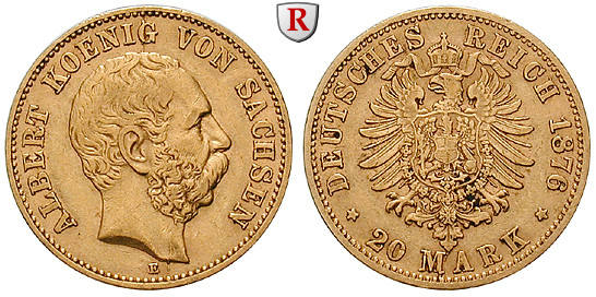 Albert 1873-1902. 20 Mark 1876 E. J. 262; GOLD, sehr schön +