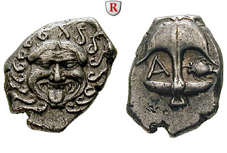 Drachme 15 mm 5.-4.Jh. v.Chr. Gorgoneion von vorne / Anker, darin A und Garnele. SNG Cop. 453; sehr schön - vorzüglich