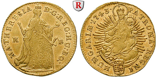 Maria Theresia 1740-1780. Dukat 22 mm 1743 Kremnitz. Stehende Kaiserin / Strahlende Madonna auf Mondsichel, darunter kleines Wappen. Friedb. 180; GOLD, sehr schön + / sehr schön-vorzüglich