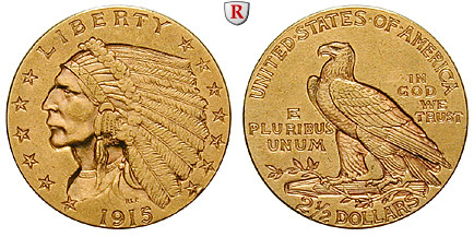 2 1/2 Dollars 3.76 g fine, 1915 Philadelphia. Friedb. 120; GOLD, extremely fine, current price