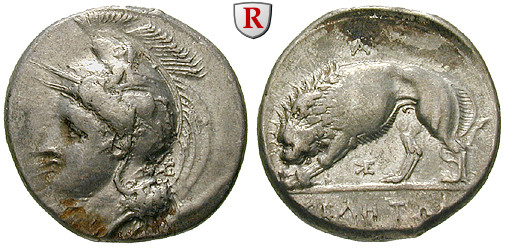 Didrachm 21 mm 334-300 BC. Head of Athena left, wearing crested Phrygian helmet decorated with centauress; monogram behind neck-guard / Lion standing left, tearing prey; monograms in fields. HN Italy 1293; very fine / very fine to extremely fine