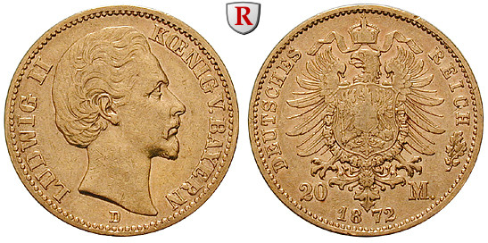 Ludwig II. 1864-1886. 20 Mark 1872 D. J. 194; GOLD, good very fine, current price