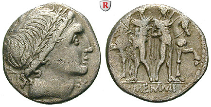 L. Memmius 109-108 BC. Denarius 18 mm 109-108 BC Rome. Male head right, with oak-wreath, value-mark before / L MEMMI Dioscuri standing facing between their horses, each holding spear. Cr. 304/1; good very fine, scratches on obv.
