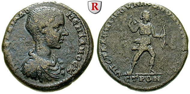 Diadumenian, Caesar 217-218. AE-AE 26 mm. Consular legate, Statius Longinus. Bare, draped and cuirassed bust right / Diana standing right, holding bow and reaching for an arrow. AMNG 1842; very fine, fields smoothed