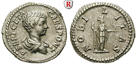 Geta, Caesar 198-209. Denarius 19 mm 199 Rome. Draped and cuirassed bust right P SEPT GETA CAES PONT / NOBILITAS Nobilitas standing right, holding palladium and scepter. RIC 13; nearly extremely fine