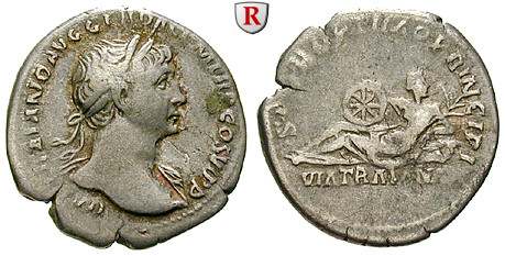 Trajan 98-117. Denarius 19 mm 112-117 Rome. Laureate bust r., drapery on left shoulder IMP TRAIANO AVG GER DAC P M TR P COS VI PP / SPQR OPTIMO PRINCIPI VIA TRAIANA Personification of Via Traiana reclining l., holding branch and wheel. RIC 266; very fine, flan flaws on obv.