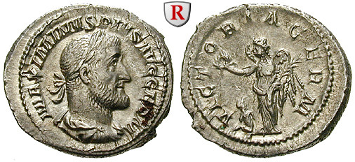 Maximinus I 235-238. Denarius 21 mm 236-238 Rome. Laureate, draped and cuirassed bust right MAXIMINVS PIVS AVG GERM / VICTORIA GERM Victory standing left, holding wreath and palm; seated German captive at her feet. RIC 23; extremely fine, minor encrustation on obv.