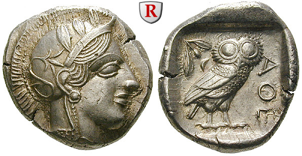 Tetradrachme 26 mm 2. Hälfte 5.Jh. v.Chr. Kopf der Athena r. mit attischem Helm / Eule r., dahinter Olivenzweig und Mondsichel. Svoronos Taf. 11ff.; vorzüglich / vorzüglich +