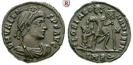 Zur Münzgeschichte: Die Münzprägung des Valens entspricht der seines Bruders, Valentinianus I., d.h. die Einheit der beiden Reichshälften war auf diesem Gebiet noch vorhanden. Gleich zu Beginn ihrer Regierung (365) kam es zu einer Verkleinerung der Bronzemünzen (17 mm). Diese Kleinmünzen bildeten nun das Hauptnominal neben der neuen und leichten Siliqua (2,25 g Silber).