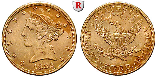5 Dollars 22 mm 7,52 g fein, 1882 Philadelphia. Liberty. Friedb. 143; GOLD, fast vorzüglich / vorzüglich +, Kratzer auf Vs.