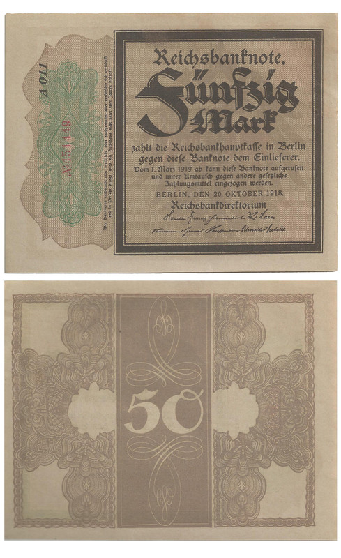 50 Mark 20.10.1918. Rb. 56e; nearly uncirculated