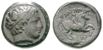 Philipp II. 359-336 v.Chr. AE-Tetrachalkon 18 mm 359-336 v.Chr. Makedon. Mzst. Apollonkopf mit Taenie r. / Reiter, Beizeichen. SNG Cop. 600ff.; sehr schön +