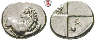 Hemidrachme um 480-350 v.Chr. Kardia. Protome eines r. rennenden Löwen, Kopf l. / Schachbrett-Incusum; in den beiden vertieften Feldern Pentagramm, Punkt, Monogramm. SNG Cop. stempelfrisch