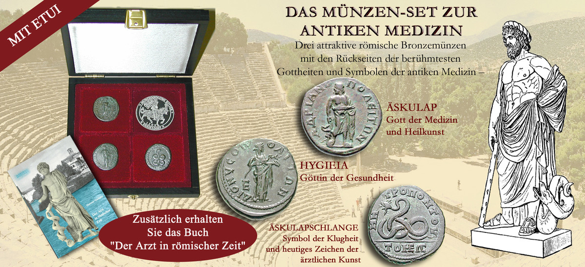 Diverse Herrscher . Bronze ca.28 mm 2.-3. Jh.n.Chr. SET bestehend aus drei verschiedenen römischen Provinzialprägungen mit den Motiven: Äskulap, Hygieia, Schlange. Dazu das Buch Der Arzt in römischer Zeit. sehr schön, mit Etui