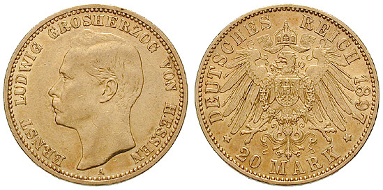 Ernst Ludwig 1892-1918. 20 Mark 1897 A. J. 225; GOLD, very fine to extremely fine