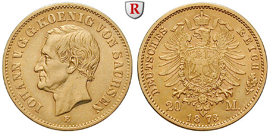 Johann 1854-1873. 20 Mark 1873 E. J. 259; GOLD, nearly extremely fine, scratches on obv.