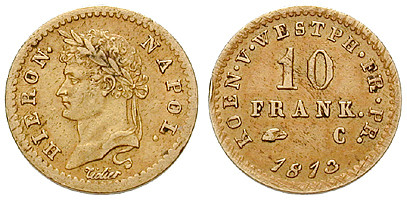 Hieronymus Napoleon 1807-1813. 10 Franken 1813 C. Friedb. 3518; GOLD, fast vorzüglich