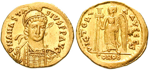 Anastasius I. 491-518. Solidus 498-518 Constantinopel. Gepanzerte Büste mit Speer und Schild, darauf Reiterkampfbild D N ANASTASIVS P P AVG / VICTORIA AVGGG S Victoria hält Langkreuz, unten CONOB. Sear 5; GOLD, sehr schön - vorzüglich