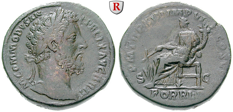 Zur Münzgeschichte: Die Münzprägung des Commodus unterteilt sich in drei signifikante Abschnitte. 175 bis 177 prägte er als Caesar. Die Münzen zeigen ein jugendliches Portrait, der Kopf trägt meistens keinen Lorbeerkranz. 177 bis 180 prägte Commodus als Augustus und Mitregent des Marcus Aurelius. Das Portrait zeigt noch immer recht jugendliche Züge, der Kopf ist allerdings meistens bekränzt. Die Titulatur ist L(ucius) AVREL(ius) COMMODVS. In den ersten Jahren seiner Alleinherrschaft ab 180 nennt er sich M(arcus) COMMODVS ANT(oninus) AUGVSTVS und verweist damit auf seinen Vater Marcus Aurelius und dessen Vorgänger Antoninus Pius. Ein fundamentaler Wechsel in der Titulatur findet 191 statt. Der Herrscher nennt sich nun L(ucius) AEL(ius) AVR(elius) COMMODVS und legt die beiden Namensteile, die sich auf seine Vorgänger beziehen, ab.