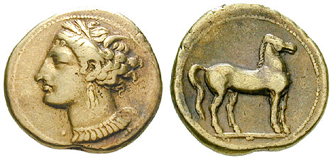 Elektron-Stater 18 mm 310-270 v.Chr. Kopf der Tanit l. mit Ährenkranz / Pferd steht r. Jenk.-Lew. 321ff.; sehr schön