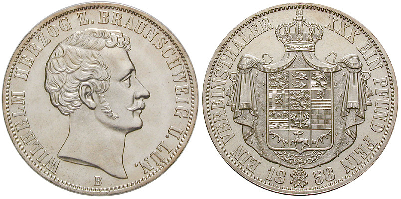 Wilhelm 1831-1884. Vereinstaler 1858 Braunschweig. AKS 81; stempelfrisch, Prachtexemplar aus polierten Stempeln