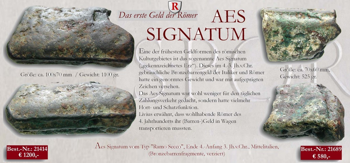 Eine der frühesten Geldformen des Römischen Kulturgebietes ist das sogenannte Aes Signatum (übersetzt: gekennzeichnetes Erz). Dieses im 4.-3.Jh.v.Chr. gebräuchliche Bronzebarrengeld der Italiker und Römer hatte ein genormtes Gewicht und war mit aufgeprägten Zeichen versehen. Das Aes Signatum war wohl weniger für den täglichen Zahlungsverkehr gedacht, sondern hatte vielmehr Hort- und Schatzfunktion. Livius erwähnt, dass wohlhabende Römer des 4. Jh.v.Chr. ihr (Barren-) Geld in Wagen transportieren mussten.