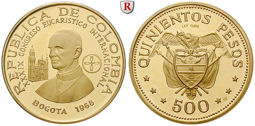 Republik seit 1886. 500 Pesos 19,35 g fein, 1968. Internationaler Eucharistischer Kongreß, Paul VI. / Wappen. Friedb. 118; GOLD, Polierte Platte