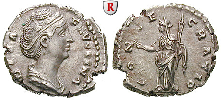 Zur Münzgeschichte: Die meisten erhaltenen Münzen sind in Rom geprägt, und zwar posthum (= nach ihrem Tode). Daher ist es nicht verwunderlich, daß sie auf den Münzabbildungen etwas matronenhaft wirkt. Es handelt sich dabei eben um eine altersgemäße Anpassung an den über 20 Jahre älteren Gemahl Antoninus Pius. Besonders der Münztyp mit der unverschleierten Büste zeigt ihre Frisur deutlich. Sie hat ihr an Stirn und Schläfen gelocktes Haar am Hinterkopf hochgesteckt und mit Perlenketten sowie einem dreifachen Perlenring, einer Art Krone, befestigt. Damit soll ihr Portrait Schönheit und Würde ausdrücken, keinesfalls aber Jugend oder ihr wahres Alter.