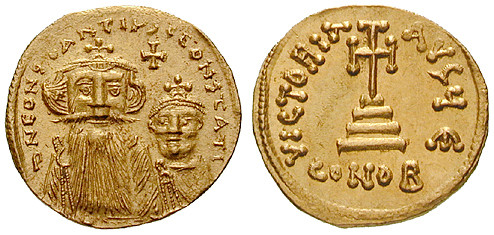 Heraclius und Heraclius Constantinus 613-641. Solidus 629-631 Constantinopel. Büsten von Heraclius mit langem Bart und Heraclius Constantinus von vorn / Stufenkreuz. Sear 749; GOLD, vorzüglich +
