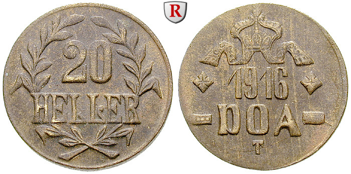 Messing-20 Heller 1916 T. Drei Blätter / Kleine Krone. J. 726b; stempelfrisch, dunkle Patina