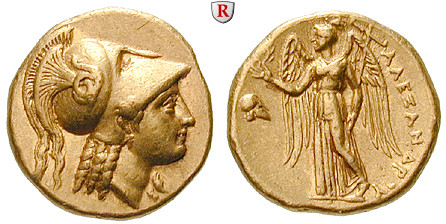 Alexander III. der Grosse 336-323 v.Chr. Stater 18 mm 325-310 v.Chr. Makedon. Mzst. Athenakopf r. mit korinthischem Helm / Nike hält Kranz und Stylis, Beizeichen korinthischer Helm. Price 794(var.); GOLD, sehr schön - vorzüglich