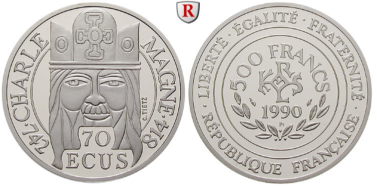 V. Republik seit 1958. Platin-500 Francs-70 Ecus 15,64 g fein, 1990. Karl der Große. Friedb. 622a; Polierte Platte