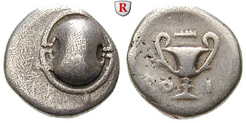 Triobol um 338-315 v.Chr. Theben. Boiotischer Schild / Kantharos, darüber Keule. SNG Cop. 170-171; sehr schön