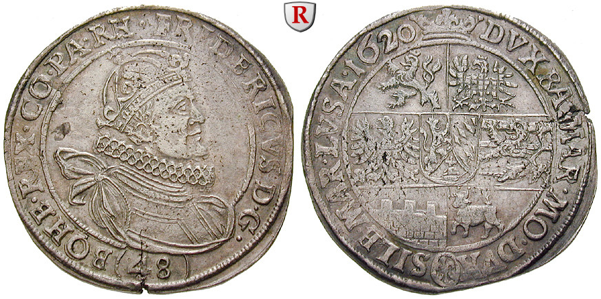 Friedrich von der Pfalz 1619-1620. 48 Kreuzer 1620 Prag. Kippermünze, Mzm. P.Skréta Sotnovsky. Großes Brustbild rechts / In drei Reihen sieben Wappen, in der ersten Böhmen und Kurpfalz, unten Mmz. Diet. 595; sehr schön +
