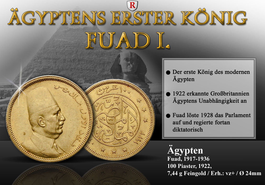 Fuad 1917-1936. 100 Piaster 24 mm 7,44 g fein, 1922. Zivilbüste, geprägt in Gelbgold. Friedb. 28; GOLD, vorzüglich +