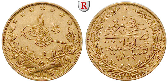 Mohammed V. 1909-1918. 100 Piaster 6,62 g fein, 1911 Konstantinopel. Jahr 4. Schl. 665; GOLD, sehr schön - vorzüglich