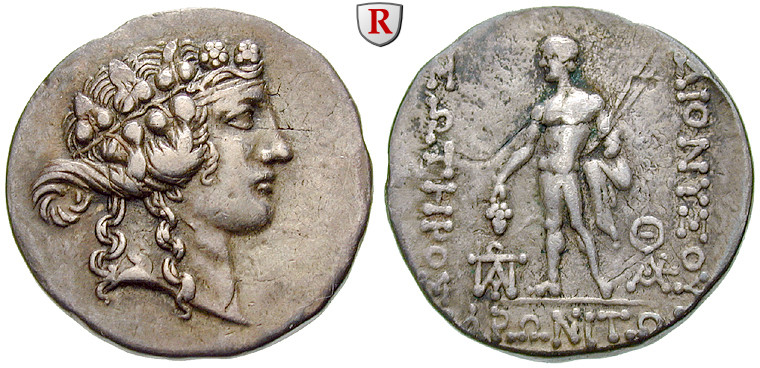 Tetradrachme um 100-80 v.Chr. Kopf des Dionysos mit Efeukranz r. / Dionysos nackt stehend, mit Nebris, Speeren und Weintraube; unten Monogramm neben Initiale. Sch.-Geiss 1099ff; sehr schön + / sehr schön, schöne Tönung