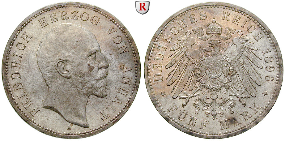 Friedrich I. 1871-1904. 5 Mark 1896 A. J. 21; stempelfrisch, alte Patina