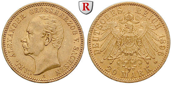 Carl Alexander 1853-1901. 20 Mark 1896 A. J. 282; GOLD, vorzüglich