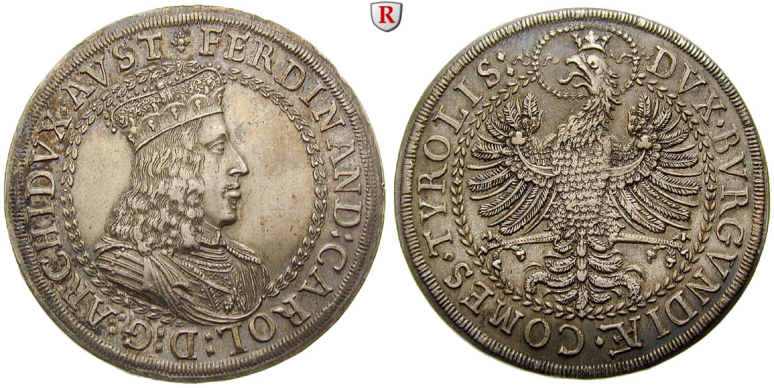Erzherzog Ferdinand Karl 1632-1662. Doppeltaler 47 mm o.J. Hall. Gekröntes, geharnischtes Brustbild nach r. / Gekrönter, l. blickender Adler, der Kopf umgeben von einem Kranz. Dav. 3364; vorzüglich +, schöne Patina