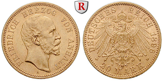 Friedrich I. 1871-1904. 20 Mark 1896 A. J. 181; GOLD, fast stempelfrisch / stempelfrisch