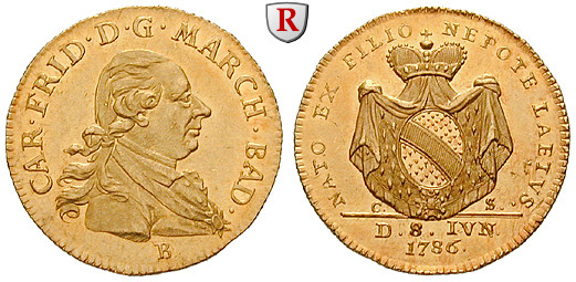 Carl Friedrich 1746-1806. Dukat 1786. Auf die Geburt des Prinzen Karl Ludwig Friedrich, des späteren Großherzogs Karl. Friedb. 147; GOLD, fast stempelfrisch