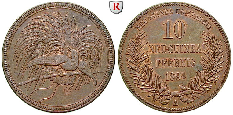 Kupfer-10 Neu-Guinea Pfennig 1894 A. Paradiesvogel. J. 703; stempelfrisch, schöne Patina