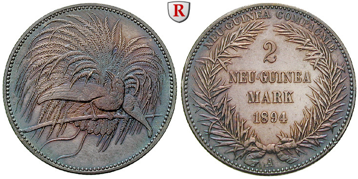 2 Neu-Guinea Mark 28 mm 1894 A. Paradiesvogel. J. 706; fast stempelfrisch, schöne Patina