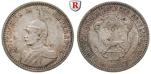 1/4 Rupie 1891. J. 711; stempelfrisch, schöne Patina