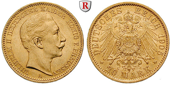 Wilhelm II. 1888-1918. 20 Mark 1905 A. J. 252; GOLD, vorzüglich-stempelfrisch