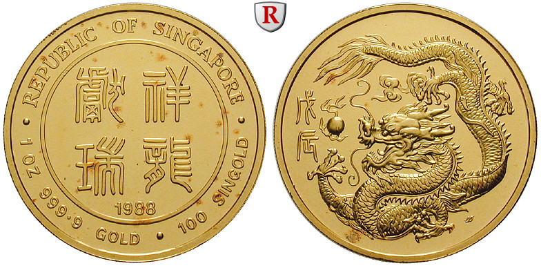 100 Singold 1988. Chinesischer Drache. GOLD, Polierte Platte